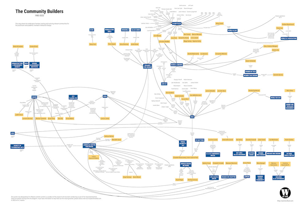 A connection diagram showing early women involved* in community building to support HCI and interaction design and the communities they built at across time. This is a printable PDF file.